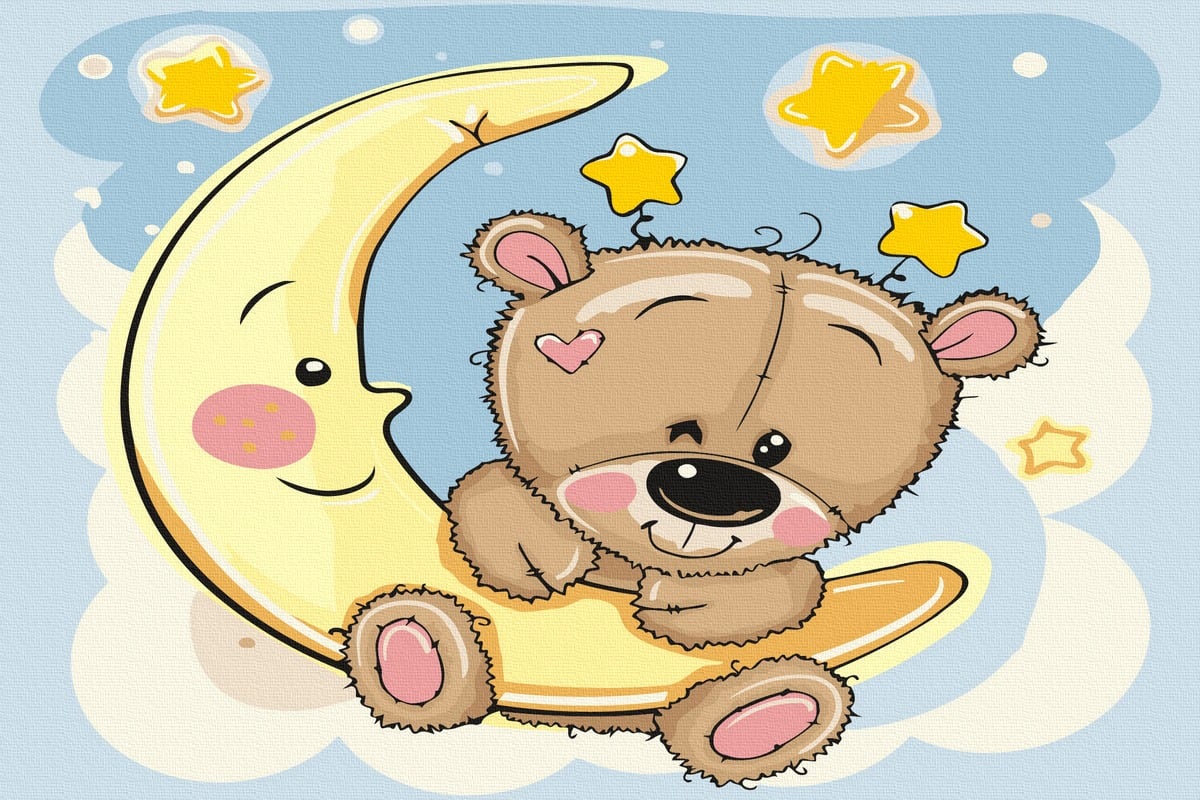 Set Acuarello, Pictura pe numere, Luna si Ursuletul, cu rama din lemn, pensule si culori acrilice
