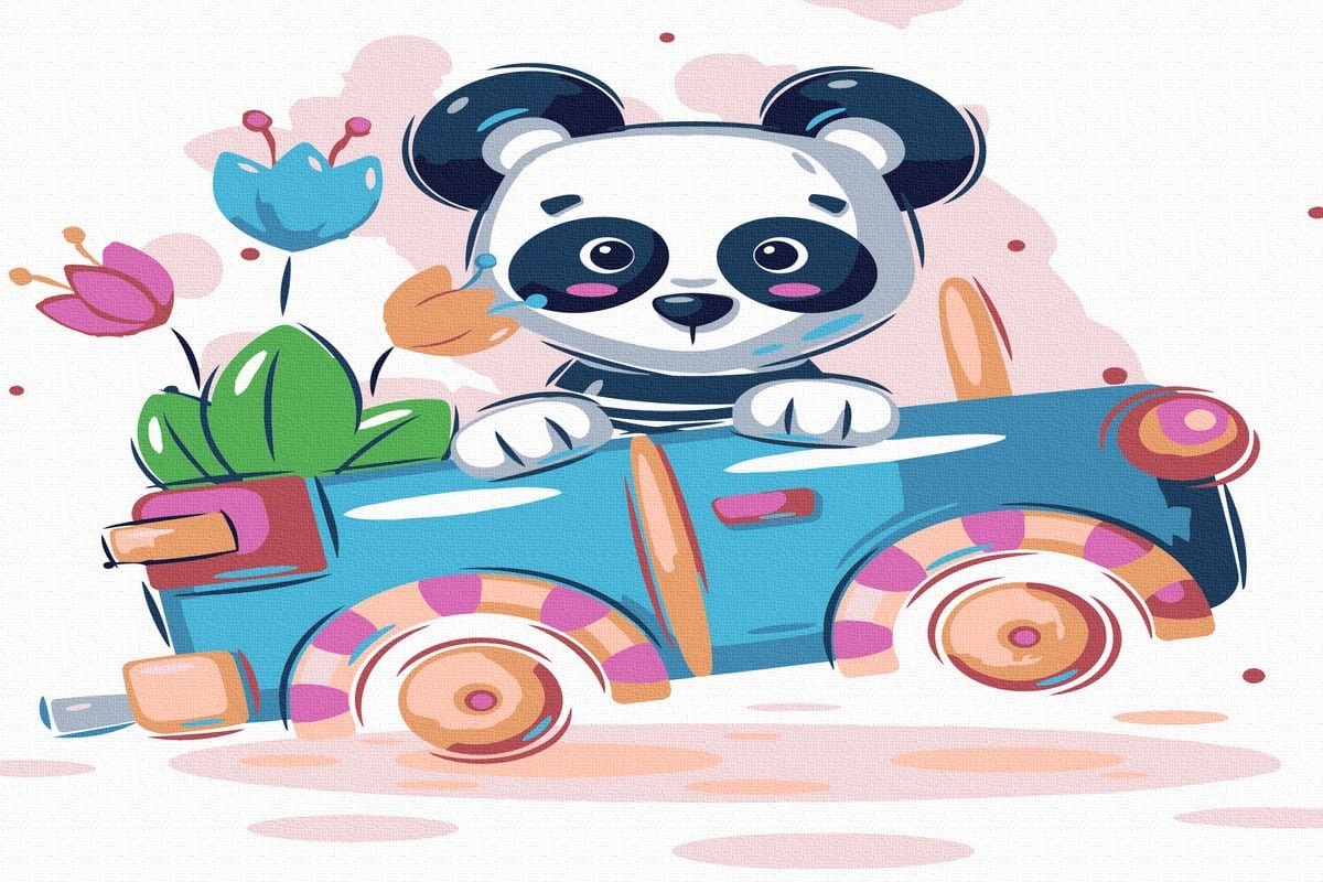 Set Acuarello, Pictura pe numere, Panda in masinuta, cu rama din lemn, pensule si culori acrilice
