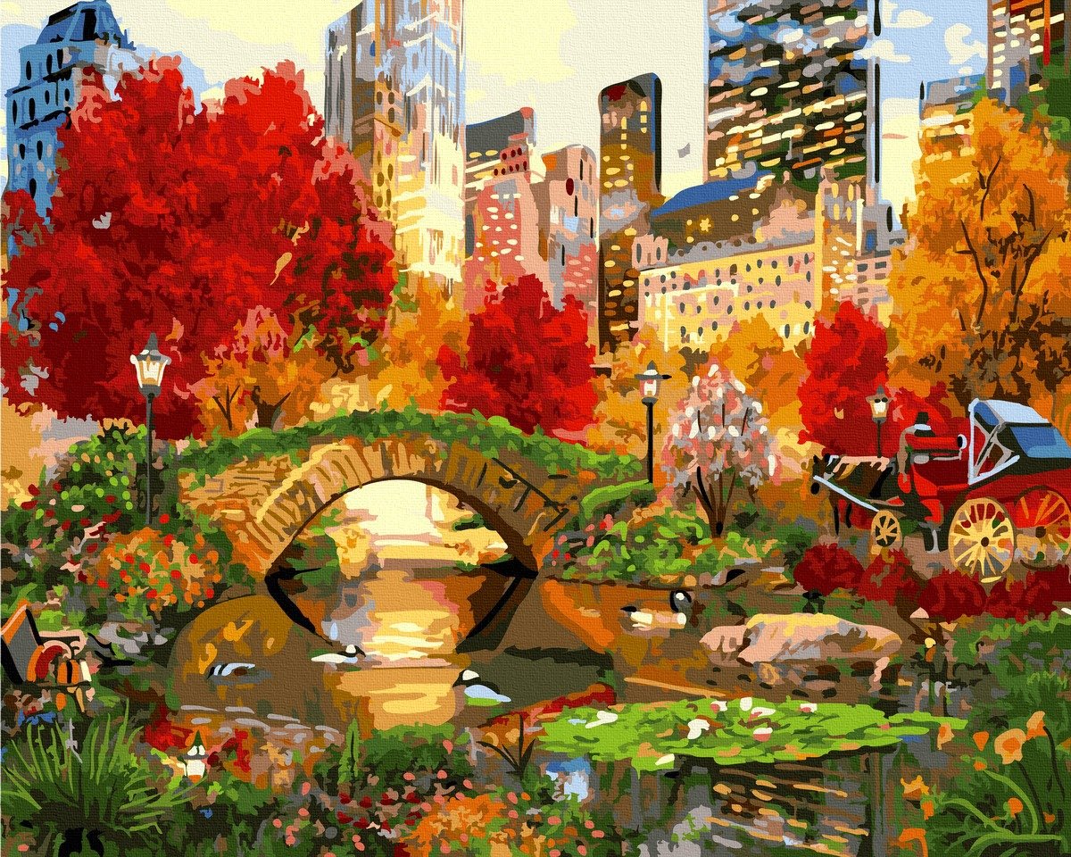 Set Acuarello, Pictura pe numere, Parcul din oras, cu rama din lemn, pensule si culori acrilice