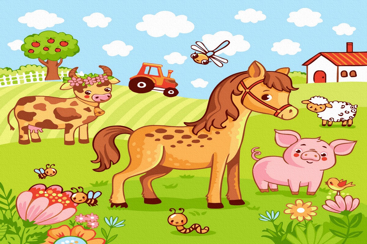 Set Acuarello, Pictura pe numere, Prietenii de la ferma, cu rama din lemn, pensule si culori acrilice