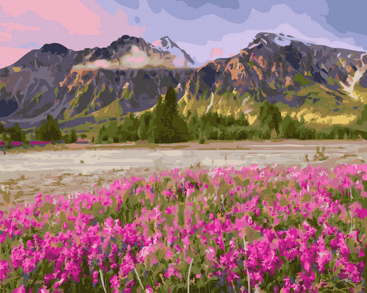 Set Acuarello, Pictura pe numere, Primavara la munte, cu rama din lemn, pensule si culori acrilice