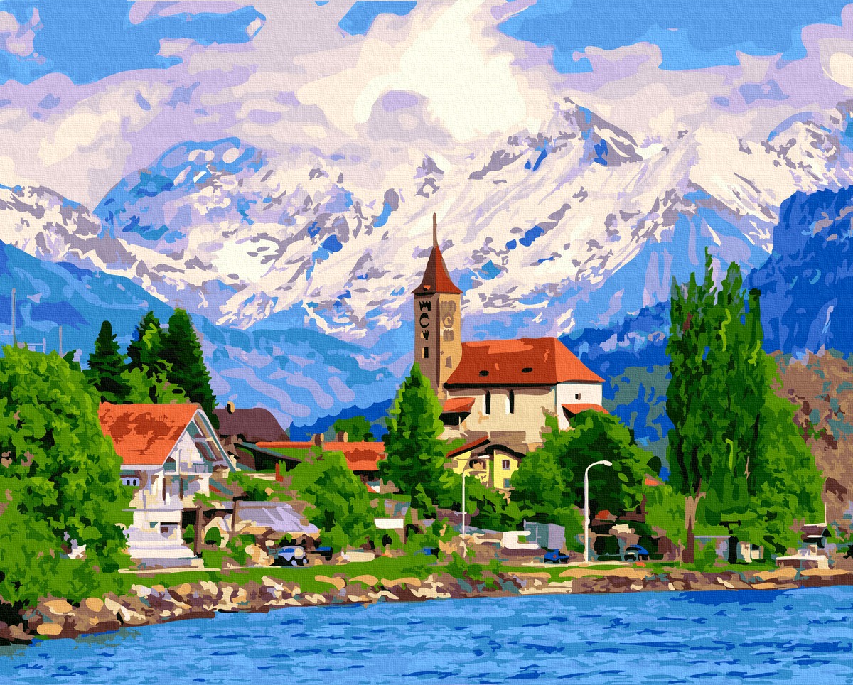 Set Acuarello, Pictura pe numere, Vedere de la munte, cu rama din lemn, pensule si culori acrilice