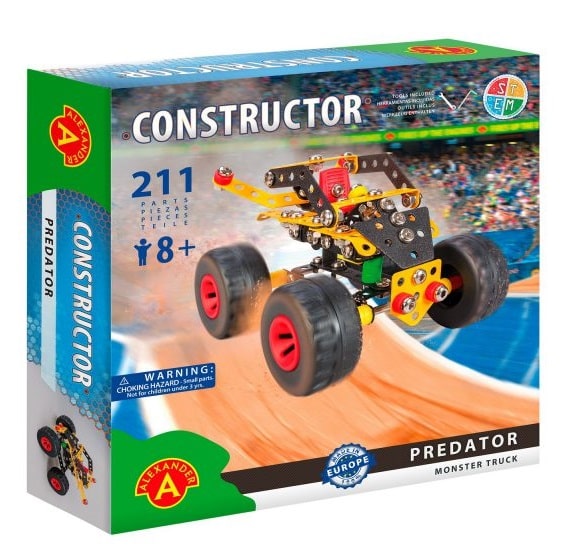 Set de constructie pentru realizarea unui Monster truck din 211 piese.CONSTRUCTOR este o serie de jucarii de asamblat. Fiecare vehicul este format din piese metalice de diferite forme si dimensiuni, cu piese complementare din plastic, care ii imbunatatesc vizual designul. Jucaria ajuta la dezvoltarea abilitatilor manuale ale copilului, viziunii in spatiu, aptitudinilor tehnice si rabdarii. Este un cadou perfect pentru copiii creativi si viitorii ingineri.De peste 40 de ani, Alexander Toys este unul dintre cei mai mari producatori de jucarii din Polonia. Compania este specializata in jocuri educationale, creative si jucarii. Unitatea de productie actuala este de 10.000 m² si au un spatiu de depozitare de 4.000 m².Brandul este extrem de flexibil datorita propriei tipografii, a masinilor de turnat prin injectie si a liniei de productie a pieselor metalice.Toate produsele respecta conditiile UE de calitate si siguranta.