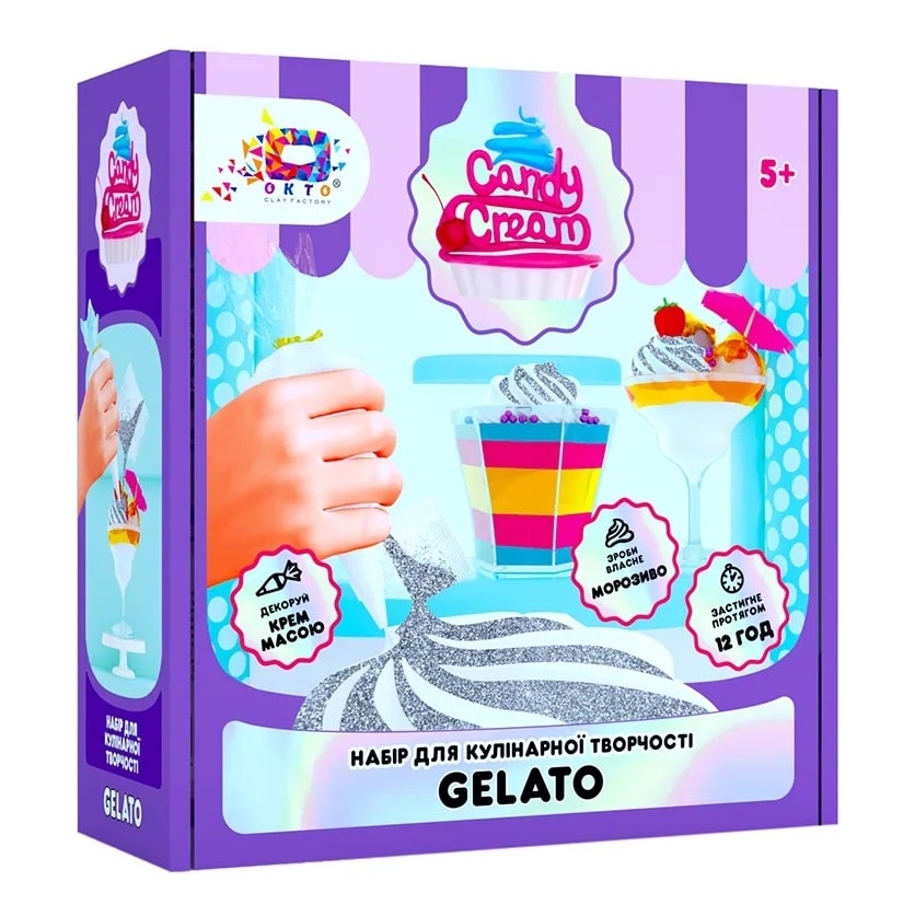 Joaca-te! Lasa-ti imaginatia sa zboare si creeaza-ti deserturile tale preferate.Setul contine:1 pasta cremoasa,4 buc argila de modelat,4 plastiline,1 slime,2 cupe pentru desert,1 punguta decoratiuni,1 instrument din plastic,1 set de stickere,5 decoratiuni,3 piese pentru ornareFrumos parfumata si colorata, pasta pentru modelat se aseamana cu o crema de prajituri. Ambalarea convenabila in pungute de ornat, cu varfuri, ii va permite copilului sa obtina forme fantastice: de la petale de flori la frunze si litere. Recomandat tinerilor cofetari cu varsta mai mare de 5 ani. Pasta de modelat pentru decorarea dulciurilor preferate va fi un decor grozav pentru micile capodopere. ATENTIE! Plastilina din ingrediente naturale se usuca in aer liber timp de 12 ore. Se combina usor cu pudra cu sclipici. Nu se lipeste de maini, nu lasa urme de culoare, se asambleaza usor de pe suprafete solide. Pentru a mentine materialul moale, pastrati-l intr-un loc ferit de aer. Pentru a reda elasticitatea materialului, adaugati cateva picaturi de apa.Acest joc il ajuta pe puiul tau sa invete sa framante, sa mototoleasca, sa intinda, sa sculpteze.Fiecare plastilina are aroma proprie, folosindu-se o tehnologie inovatoare ce permite amestecarea plastilinei pentru a obtine culori si nuante noi.Acest joc dezvolta:abilitatile motorii ale mainilor si degetelorcoordonarea miscarilor si utilizarea ambelor mainicreativitatea si imaginatia,simtul esteticmemoria si atentiagandirea spatiala si logicaabilitatile de vorbire si comunicarecoordonarea ochi-mana si perseverentaOKTO este o companie producatoare de materiale si truse creative, fiind fondata in 2016 de catre o femeie. Colectivul lucreaza zilnic pentru a crea produse pe care le comercializeaza in peste 15 tari.