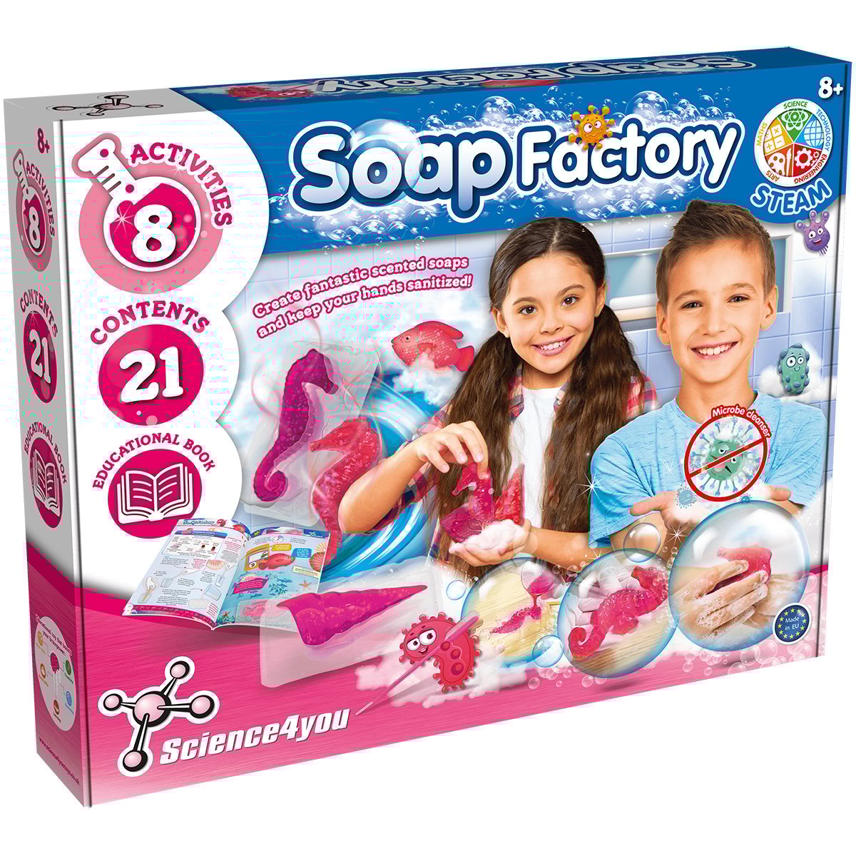 Fabrica de Sapun de la Science4you va va permite sa creati sapunuri parfumate handmade fantastice, cu ajutorul lor va pastrati mainile igienizate! Ai grija de tine cu sapunuri fantastice de casa ! Cu aceasta fabrica de sapun pentru copii, veti putea sa va creati propriile sapunuri si sa aflati mai multe despre stiinta lor! Aflati cum sa va spalati corect mainile si sa aveti o piele perfecta, sa produceti sapunuri exfoliante, sa faceti sapunuri parfumate si colorate sub forma de peste, cal de mare si concheta si multe alte experimente! Continut: manual de instructiuni, colorant cosmetic roz, baza de parfum, sticla cu vaporizator, stickeredecorative, pahar gradat mic, pipeta Pasteur, spatule de lemn, sare de mare, baza de sapun, manusi de latex natural, mulaje, pungi pentru cadouri. Dimensiuni produs in ambalaj: 38 x 30 x 6 cmVarsta recomandata: 8 ani +Atentie! Contraindicat copiilor mai mici de 3 ani. Jucaria poate contine piese mici, care se pot inghiti sau inhala, existand pericolul de sufocare.