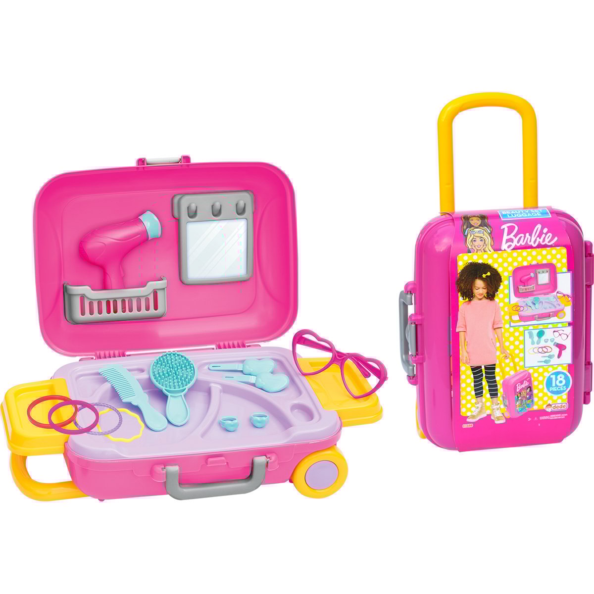 Troller cu accesorii de infrumusetare Barbie. Pachetul contine:- valiza, pieptan, perie, uscator de par, oglinda si alte accesorii Dimensiuni produs in ambalaj: 23.5 x 35.5 x 12.5 cmVarsta recomandata: 3 luni + Atentie! Contraindicat copiilor mai mici de 3 ani. Jucaria poate contine piese mici, care se pot inghiti sau inhala, existand pericolul de sufocare.