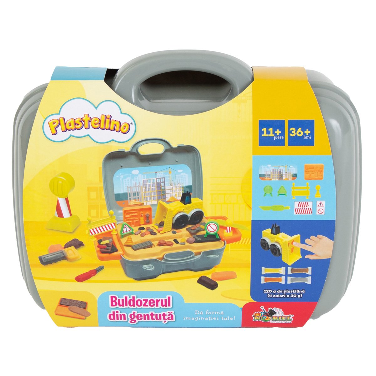 Set de joaca cu plastilina, Buldozerul din gentuta, Plastelino Gentuta compartimentata in care creezi, expui si pastrezi toate creatiile tale de plastilina are un maner cu ajutorul careia o poti transporta usor. Pachetul contine:- 120 g plastilina, 4 culori x 30 g- 11 piese+: gentuta-santier, buldozer, instrumente pentru modelat, accesorii pentru santier, sticker decorativ. Dimensiuni: 26 x 21 x 12 cm Varsta recomandata: 3 ani+Atentie! Contraindicat copiilor mai mici de 3 ani. Jucaria poate contine piese mici, care se pot inghiti sau inhala, existand pericolul de sufocare. Nu lasati ambalajele jucariilor la indemana copiilor. Indepartati orice ambalaj al jucariei inainte de a o oferi copilului.