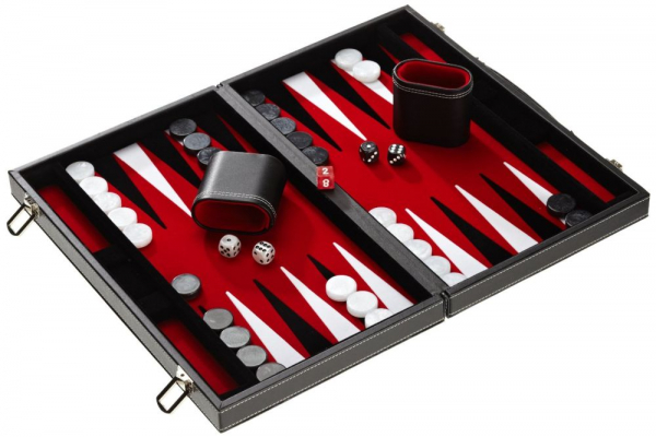 Superb joc de table Backgammon tip servieta. Servieta din piele ecologica la exterior cu cusaturi albe si material plusat la interior, ceea ce confera jocului de table o atmosfera placuta si silentioasa comparativ cu seturile traditionale din lemn….