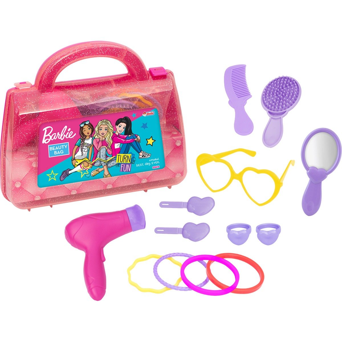 Setul de infrumusetare Barbie cu diverse accesorii. Pachetul contine:- 1x geanta pentru depozitare- 1x feon- 1x oglinda- 1x peiptan- 1x perie- alte accesorii Dimensiuni produs in ambalaj: 39.5 x 85 x 28.7 cmVarsta recomandata: 3 ani + Atentie! Contraindicat copiilor mai mici de 3 ani. Jucaria poate contine piese mici, care se pot inghiti sau inhala, existand pericolul de sufocare.