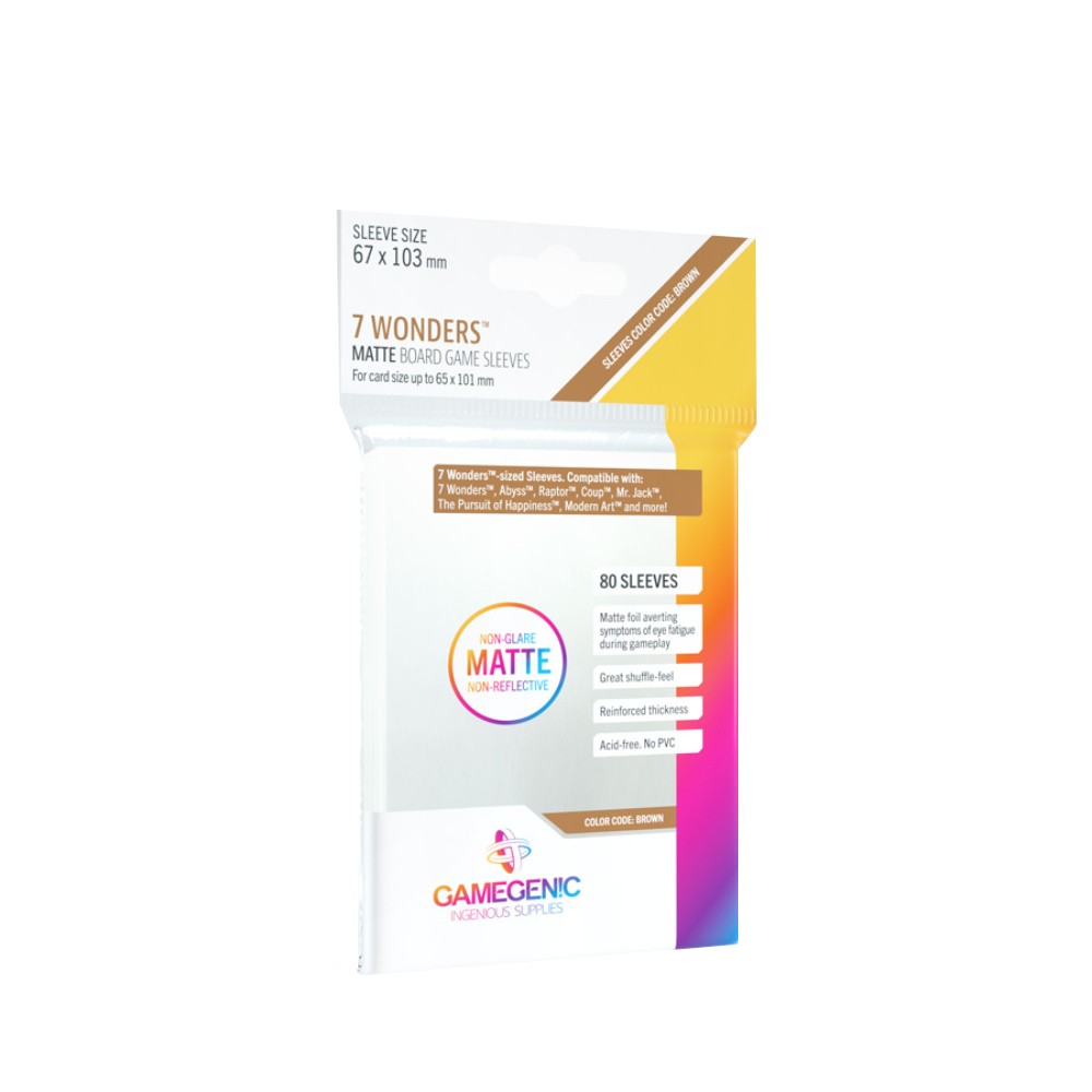 Acest pachet contine 80 de sleeve-uri care vin sa va protejeze cartile pe care le folositi in diverse jocuri, precum 7 Wonders. Acestea sunt transparente, mate, nu contin compusi PVC si au dimensiunile ideale pentru a va pastra in siguranta fiecare carte