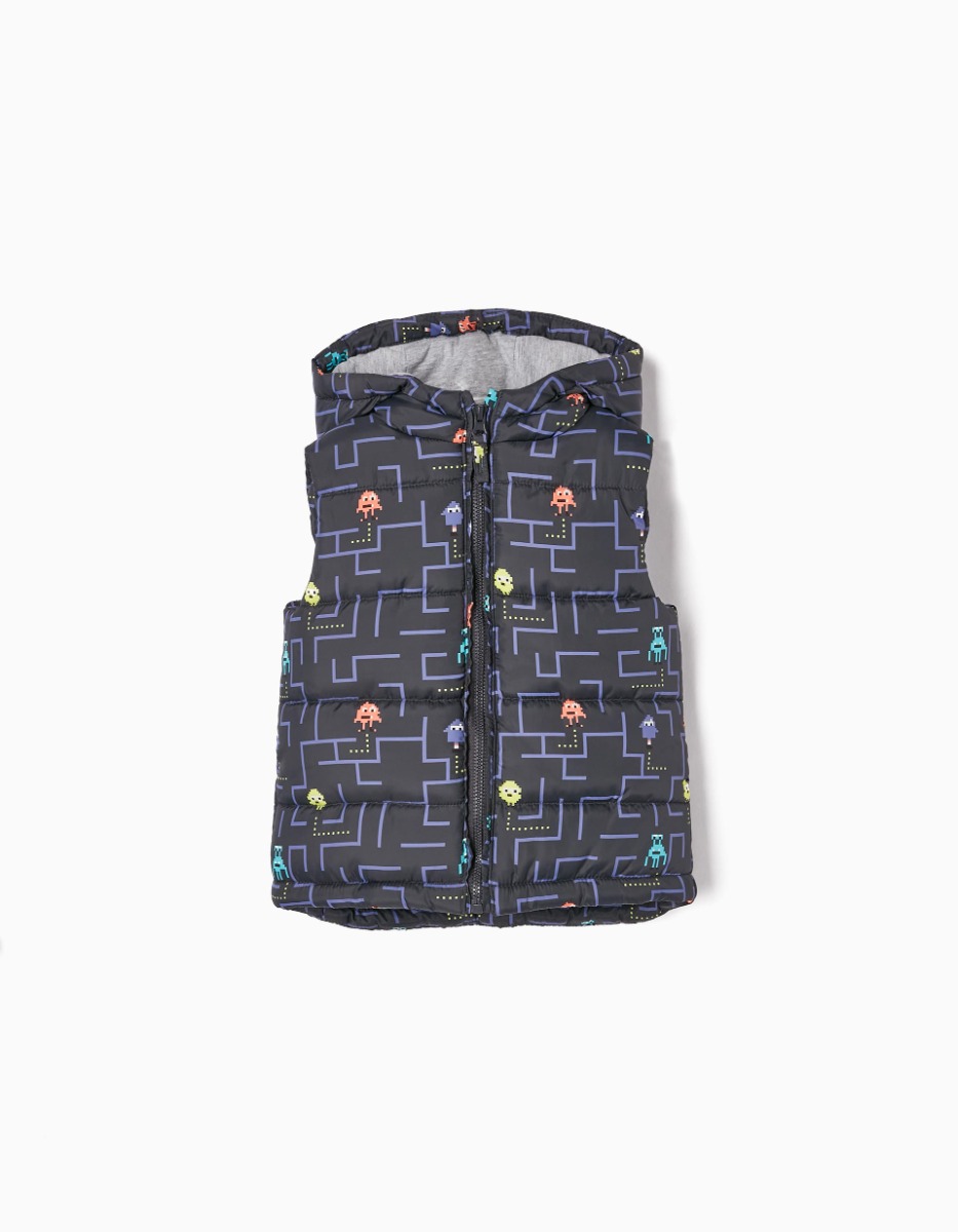 Vesta captusita pentru baieti, cu model imprimat pe tema jocurilor video. Are gluga si captuseala din jerseu, inchidere cu fermoar pentru imbracare usoara si eticheta interioara pentru identificarea copilului. O vesta confortabila, moderna si originala pentru a tine copiii de cald in sezonul rece. Compozitie material: 100% Poliester